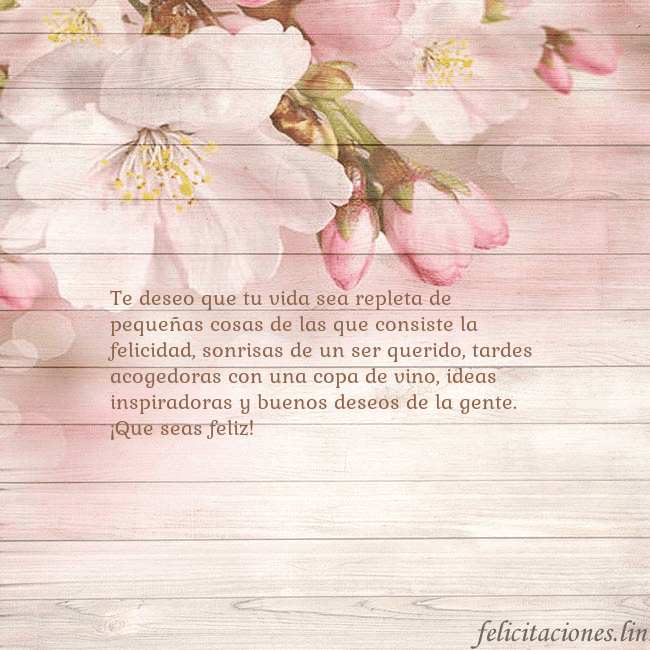 Te deseo que tu vida sea repleta de pequeñas cosas de las que consiste la felicidad, sonrisas de un ser querido, tardes acogedoras con una copa de vino, ideas inspiradoras y buenos deseos de la gente. ¡Que seas feliz!